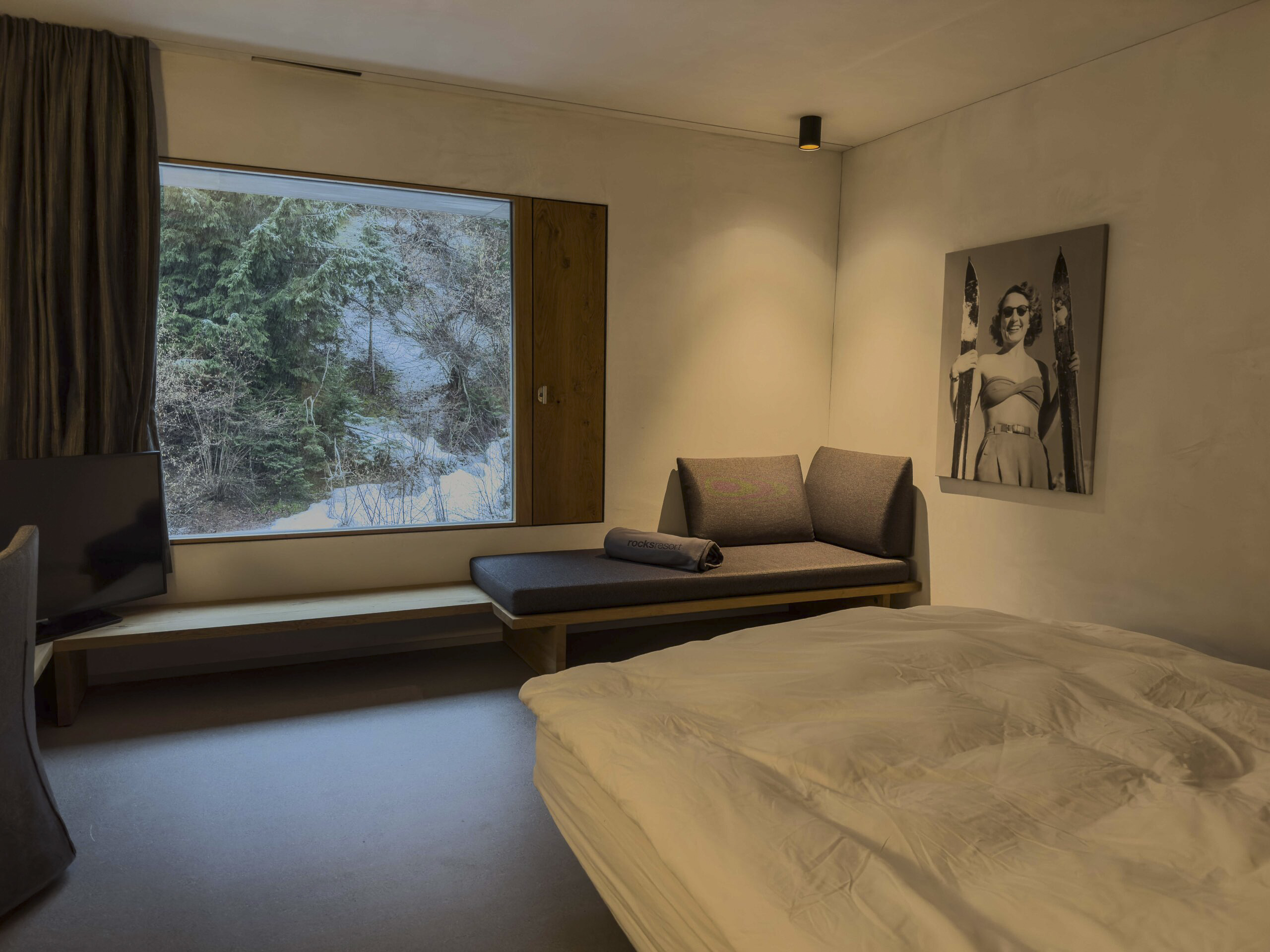 Neues Hostel in Laax Dorf direkt am Laaxersee. Familienzimmer mit Doppel- und Kajütenbett, eigenem Badezimmer und Zugang zum Hallenbad. Gegen Aufpreis auch Zugang zum SPA und Fitnessraum (Zutritt ab 14 Jahren). Frühstück im Preis inbegriffen, 3-Gang-Abendessen ab 13 Jahren CHF 19.50, Kinder 6-12 Jahre CHF 14.50, Kinder 2-5 Jahre CHF 8.50. Mit dem Postauto ab Laax Posta in 15 Minuten (inkl. Fussmarsch zur Postautohaltestelle) auf die Piste.