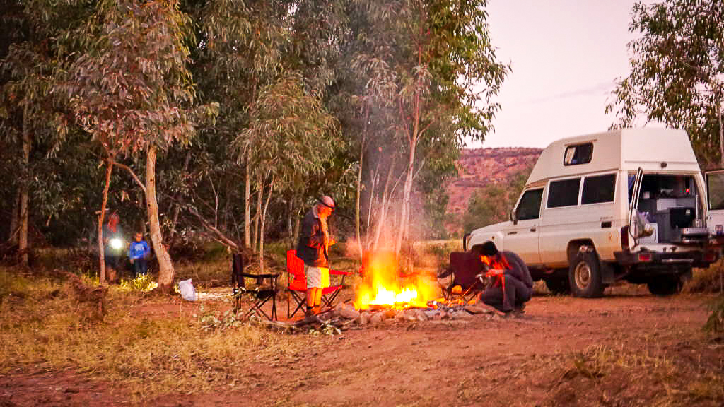 Übernachtung: Palm Valley Campground, unpowered Site ab AU$ 20/Nacht mit Duschen. Abends trifft man sich am Lagerfeuer (Marshmallows mitnehmen). Reservation erforderlich!