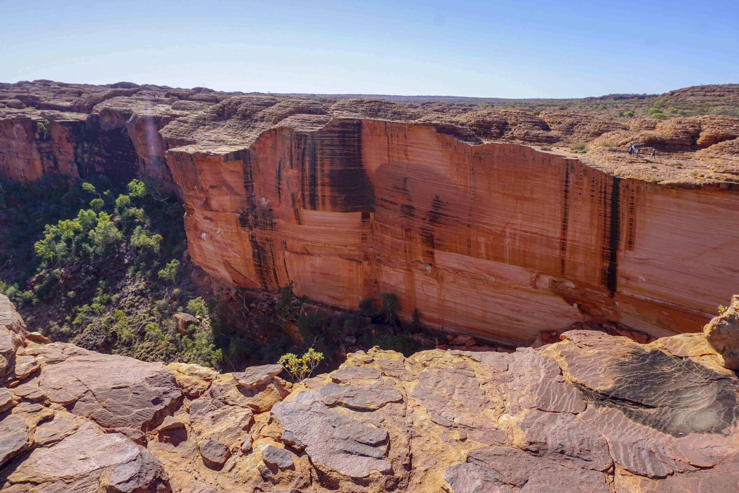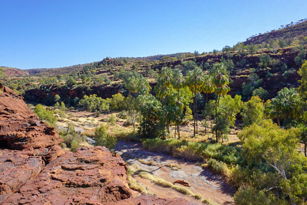 Für die 21 KM ab Hermannsburg ins Palm Valley sollte genügend Zeit eingeplant werden. Der grösste Teil der Strecke führt durch das sandige Flussbett des Finke Rivers, am Schluss folgen hohe Felsplatten, die nur mit einem Fahrzeug mit hoher Bodenfreiheit zu bewältigen sind. Wie der Name schon sagt, findet man in Mitten des roten Zentrums bis zu 26m hohe Palmen. Die zwei resp. 5 Kilometer langen Wanderwege nimmt man am besten früh morgens unter die Füsse, gegen Mittag wird es auch im australischen Winter zu heiss für ausgedehnte Wanderungen.
