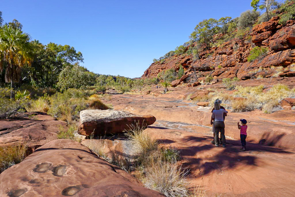 Ein früher Start lohnt sich heute, hat es auf der eigentlich kurzen Strecke viele schöne Schluchten zu entdecken. Für kurze Kinderbeine eignet sich z.B. die 30 minütige Wanderung zum Ghost Gum Tree Lookout in der Ormiston Gorge.