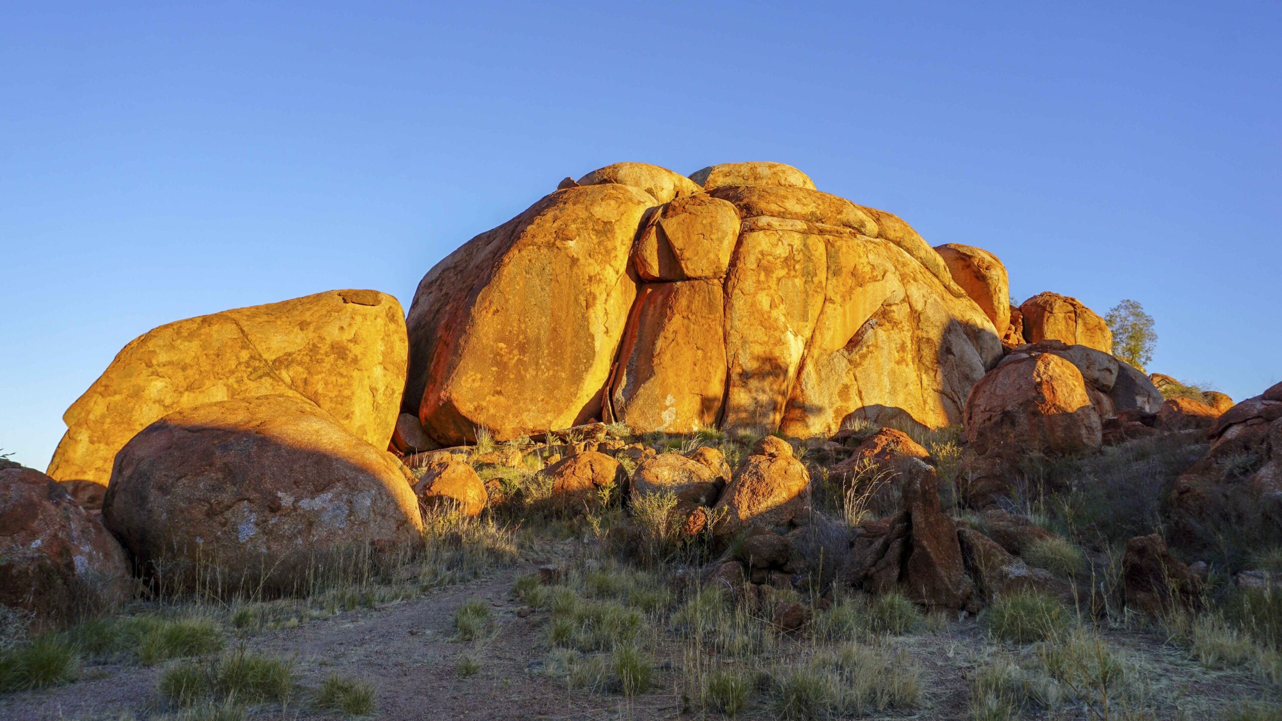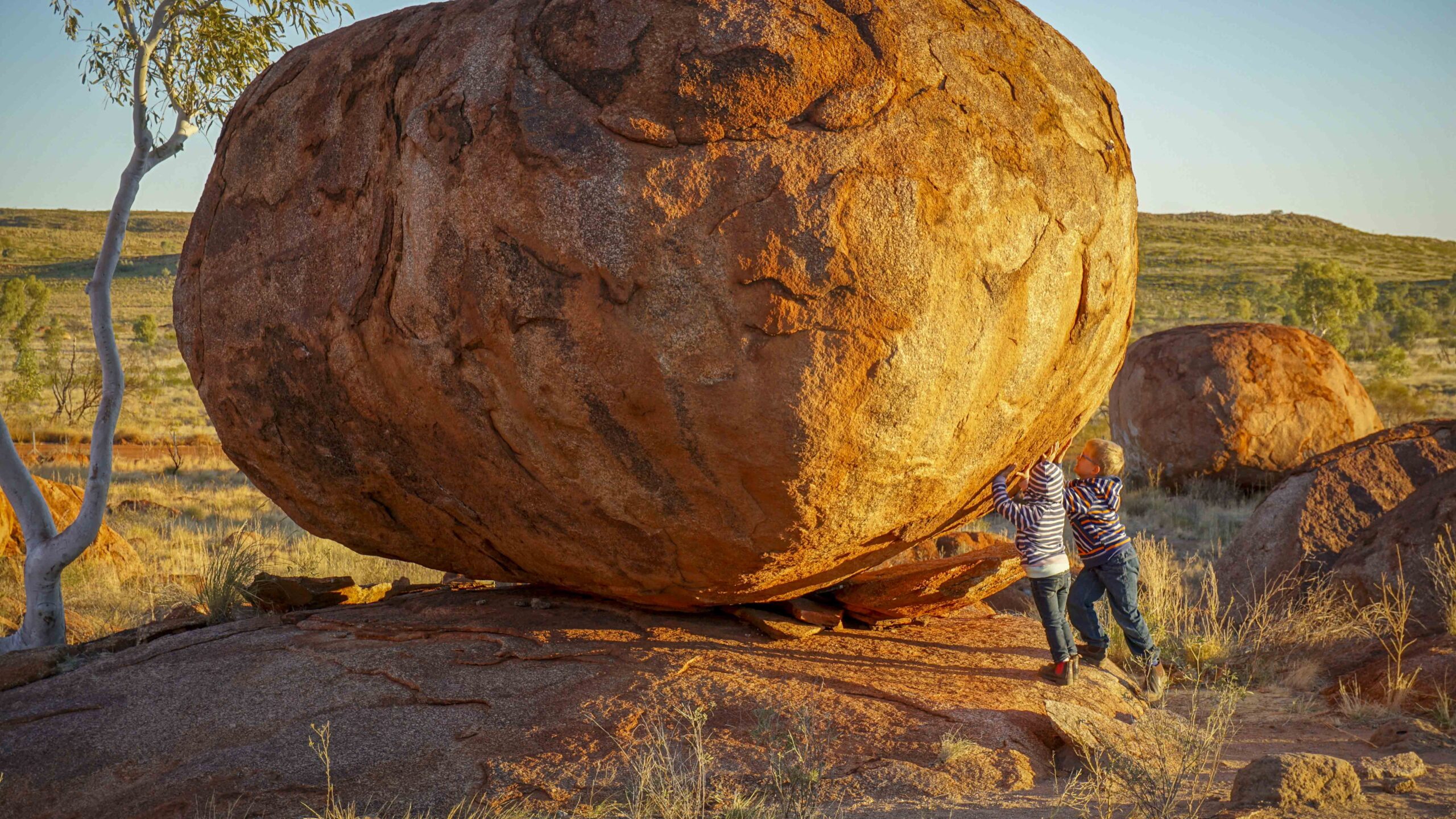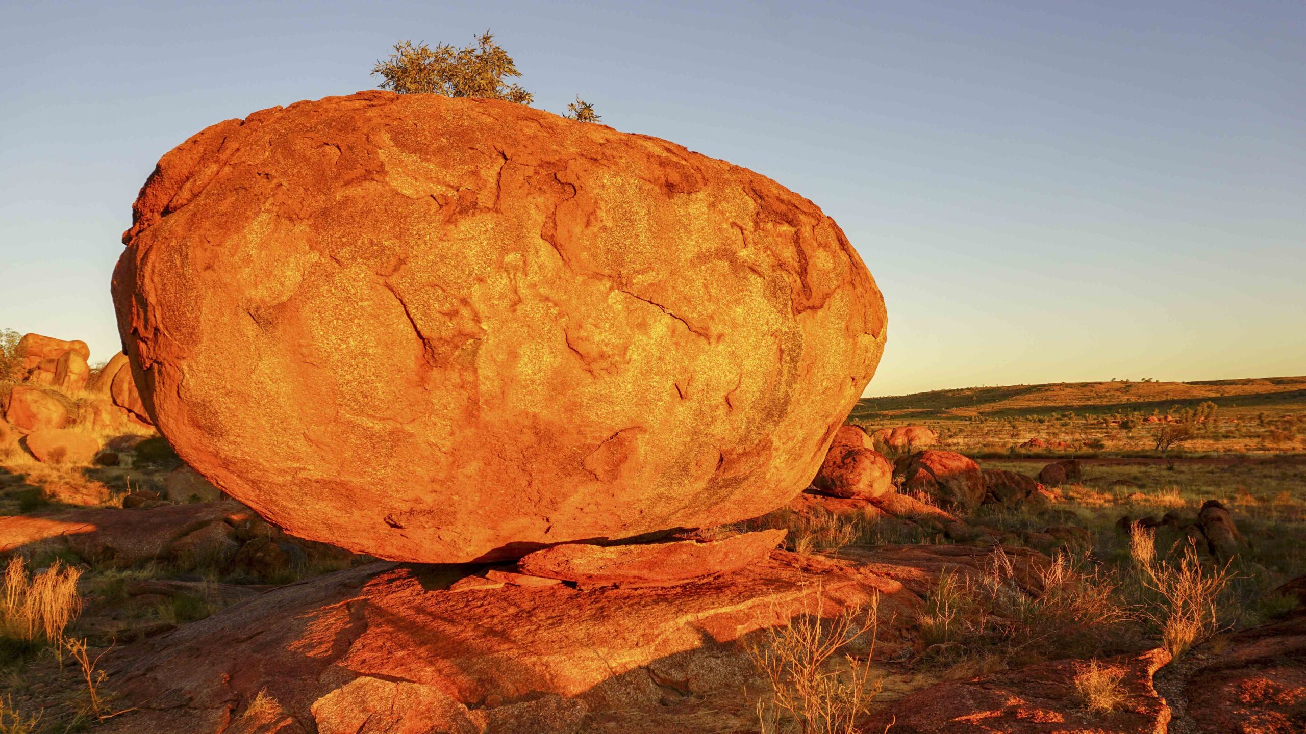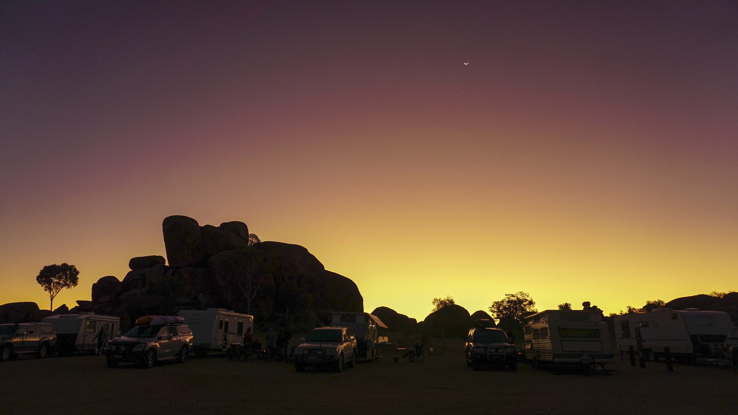 Der Sonnenuntergang bei den Devils Marbles ist wunderschön und lädt zu Schattenspielen an den riesigen Murmeln ein. Karlu Karlu ist für die Ureinwohner heilig, weshalb man NICHT auf die Felsen klettern sollte.