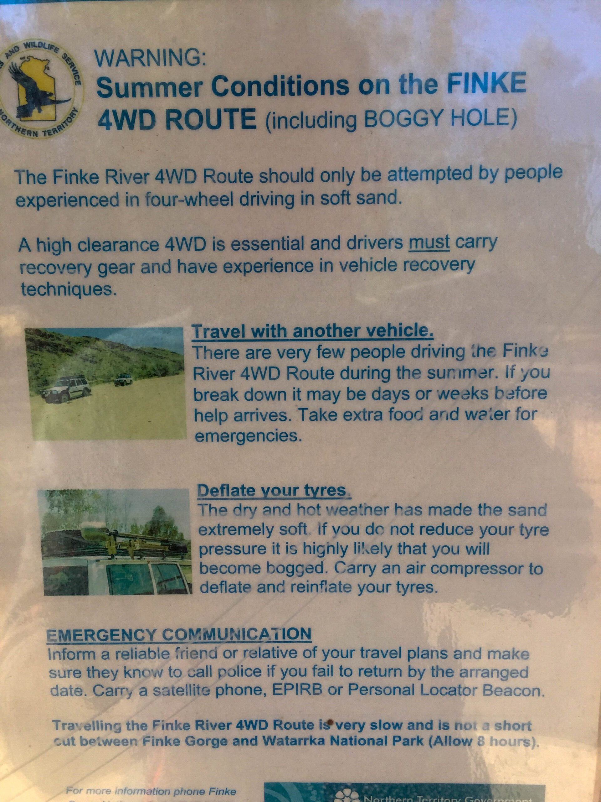 Konnte man bis vor einigen Jahren noch direkt vom Palm Valley in die Finke Gorge fahren, bleibt einem heute nur noch die Rückfahrt nach Hermannsburg. Zu viele Fahrzeuge mussten auf der anspruchsvollen Verbindungsstrecke gerettet/abgeholt werden. Zurück in Hermannsburg müssen zwingend die Vorräte aufgefüllt und genügend Wasser eingekauft werden.