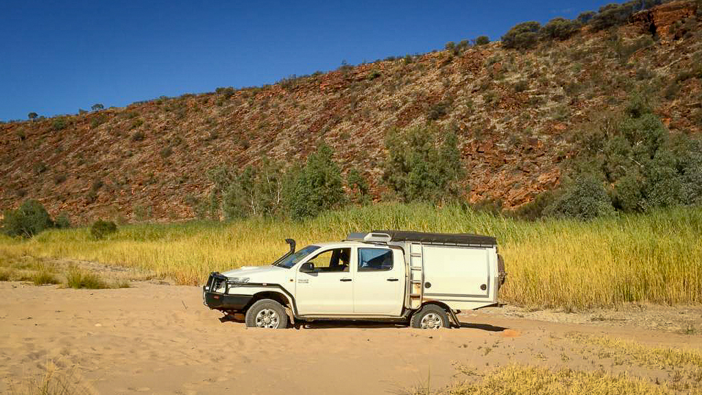 Die nächsten zwei Tage verbringen wir fernab der Zivilisation. Der Weg ist das Ziel und man sollte die Strecke wenn möglich nicht allein fahren. Das Nachtlager wird irgendwo am Finke River aufgeschlagen. 8UNG: Es gibt auf der ganzen Strecke keine Sanitäreneinrichtungen, dafür aber ganz viel unberührte Natur.