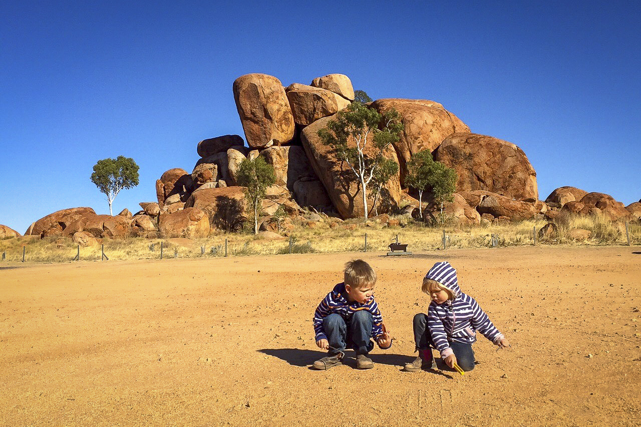 Der Sonnenuntergang bei den Devils Marbles ist wunderschön und lädt zu Schattenspielen an den riesigen Murmeln ein. Karlu Karlu ist für die Ureinwohner heilig, weshalb man NICHT auf die Felsen klettern sollte.