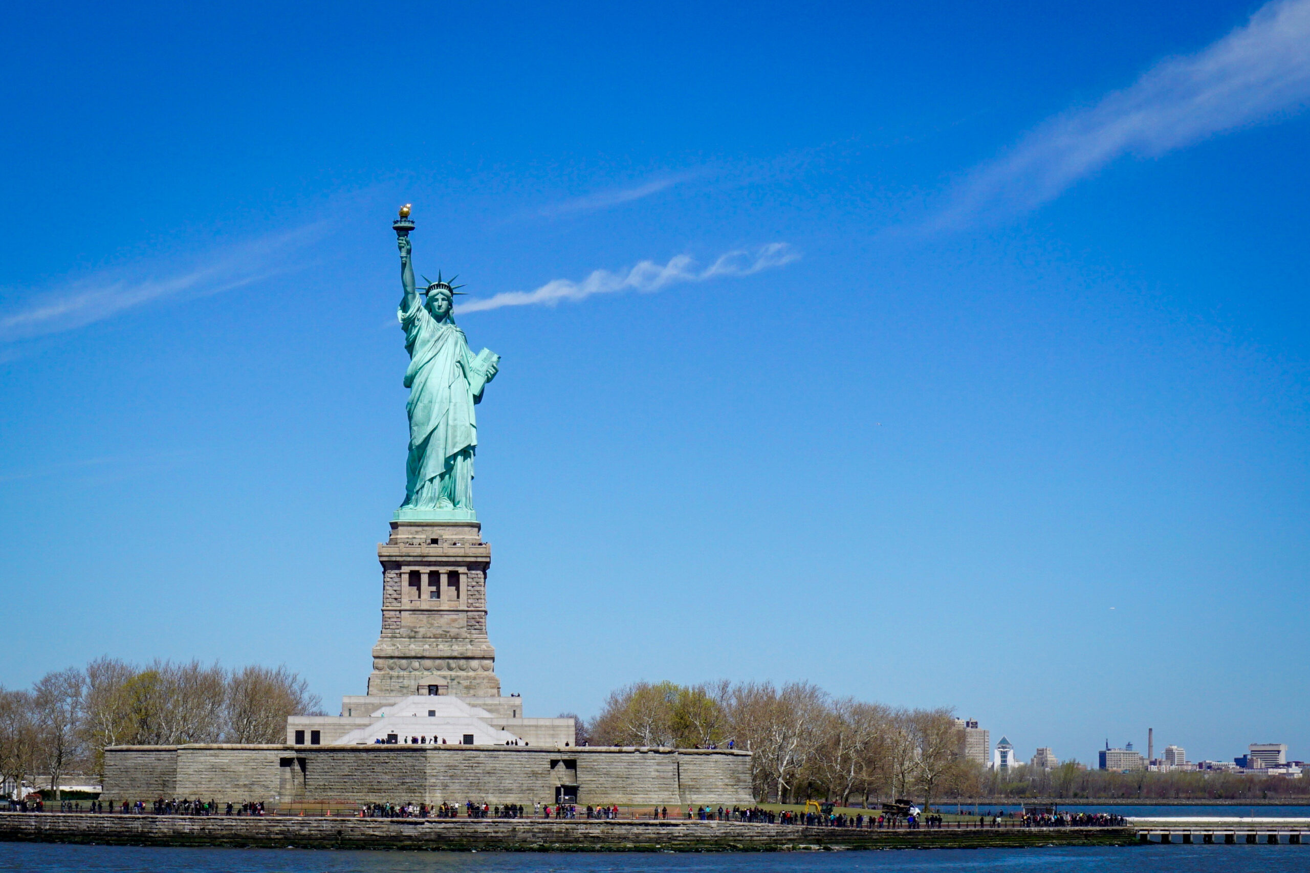 Eine Fahrt mit der Fähre nach Liberty Island bietet nicht nur die Möglichkeit, die ikonische Freiheitsstatue aus nächster Nähe zu sehen, sondern auch einen atemberaubenden Blick auf die Skyline von Manhattan.
