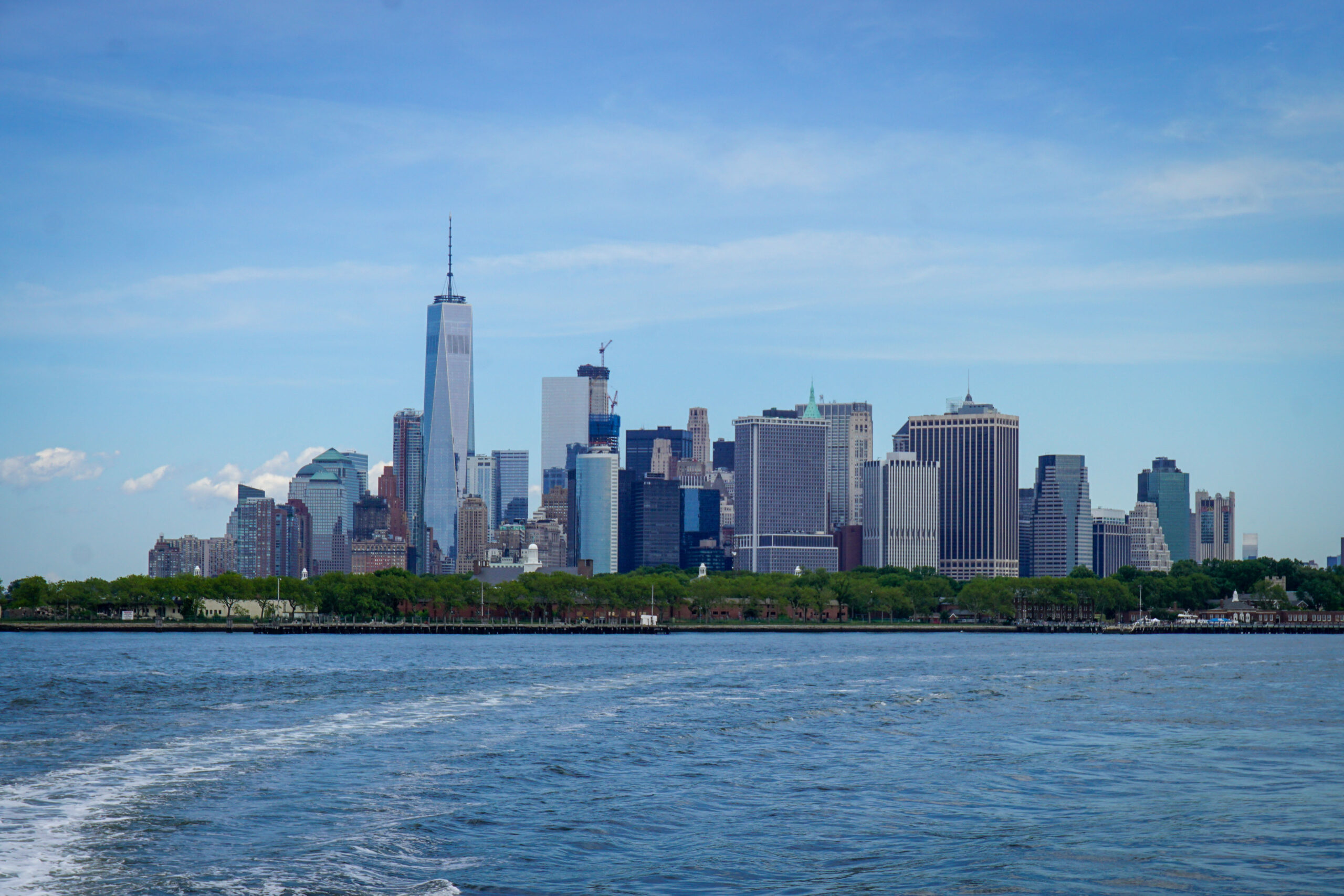 Freiheitsstatue und Skyline von der Fähre