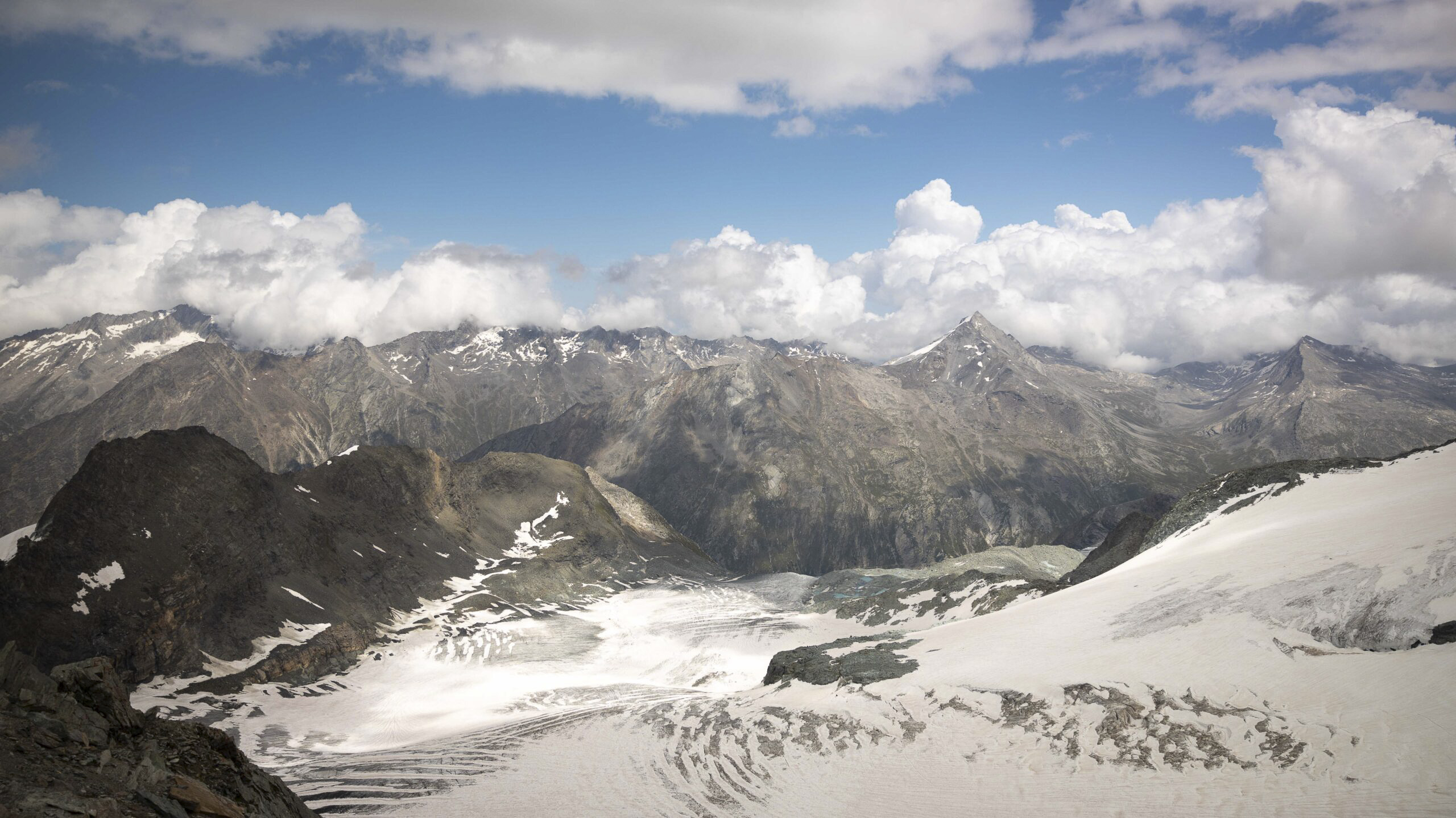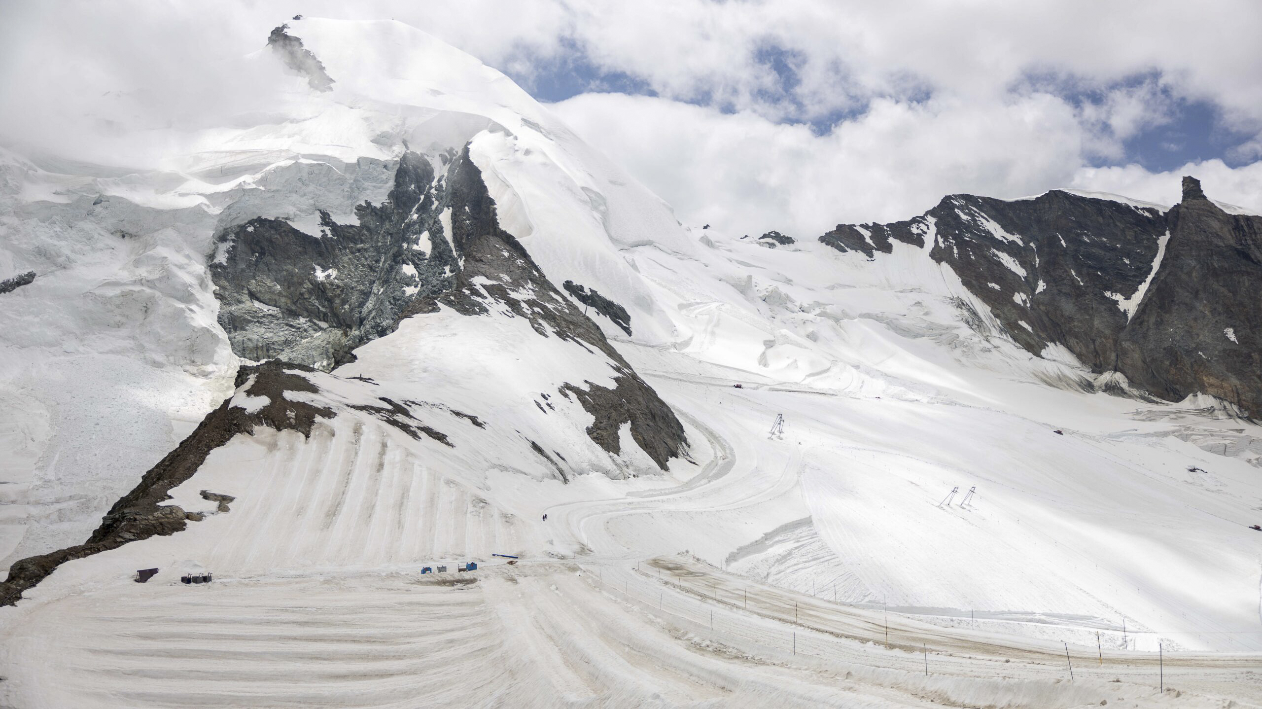 Mit der Felskinn-Gondel und der Metroalpin sind wir auf den Mittelallalin gefahren. Auf 3500 m über Meer befindet sich ein Drehrestaurant sowie der Eispavillon. Rund um das Drehrestaurant befinden sich Aussichtspunkte, von welchen man die umliegenden 4000er und den Feegletscher bestaunen kann. Ich hatte mir den Gletscher imposanter vorgestellt. Die Folgen des Klimawandels sind gut sichtbar, das ewige Eis schmilzt unaufhaltsam weg und es ist bereits sehr viel Geröll und Fels sichtbar.