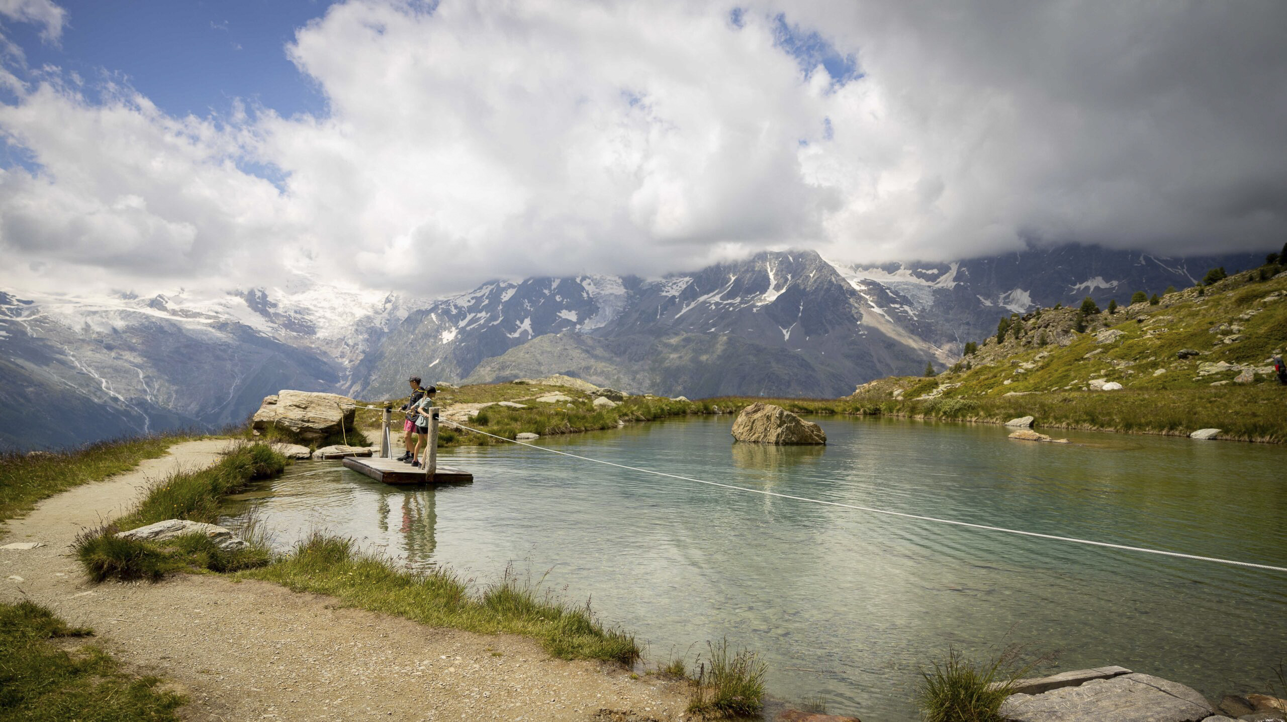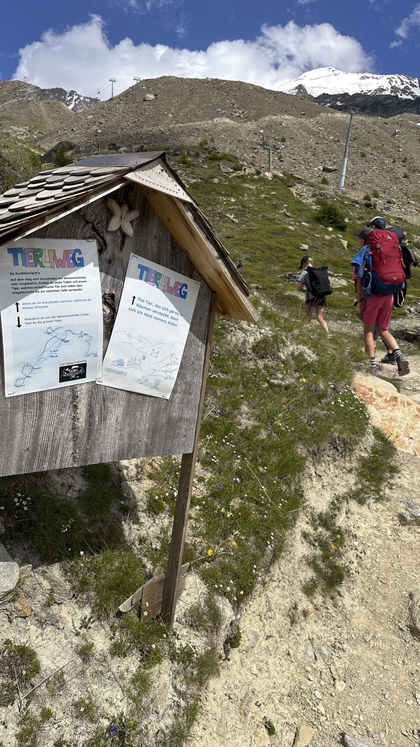 Nach dem Frühstück packten wir unsere Schlafsäcke in die Rucksäcke und fuhren mit dem Postauto nach Saas Grund, wo wir mit der Gondelbahn bis zum Kreuzboden fuhren. Vor und nach dem Mittagessen vertrieben sich Jack & Leilah die Zeit auf dem Floss am kleinen See und auf dem Spielplatz. Kurz vor 16:00 Uhr nahmen wir dann den kurzen, aber steilen Wanderweg zu Weissmiesshütte unter die Füsse.