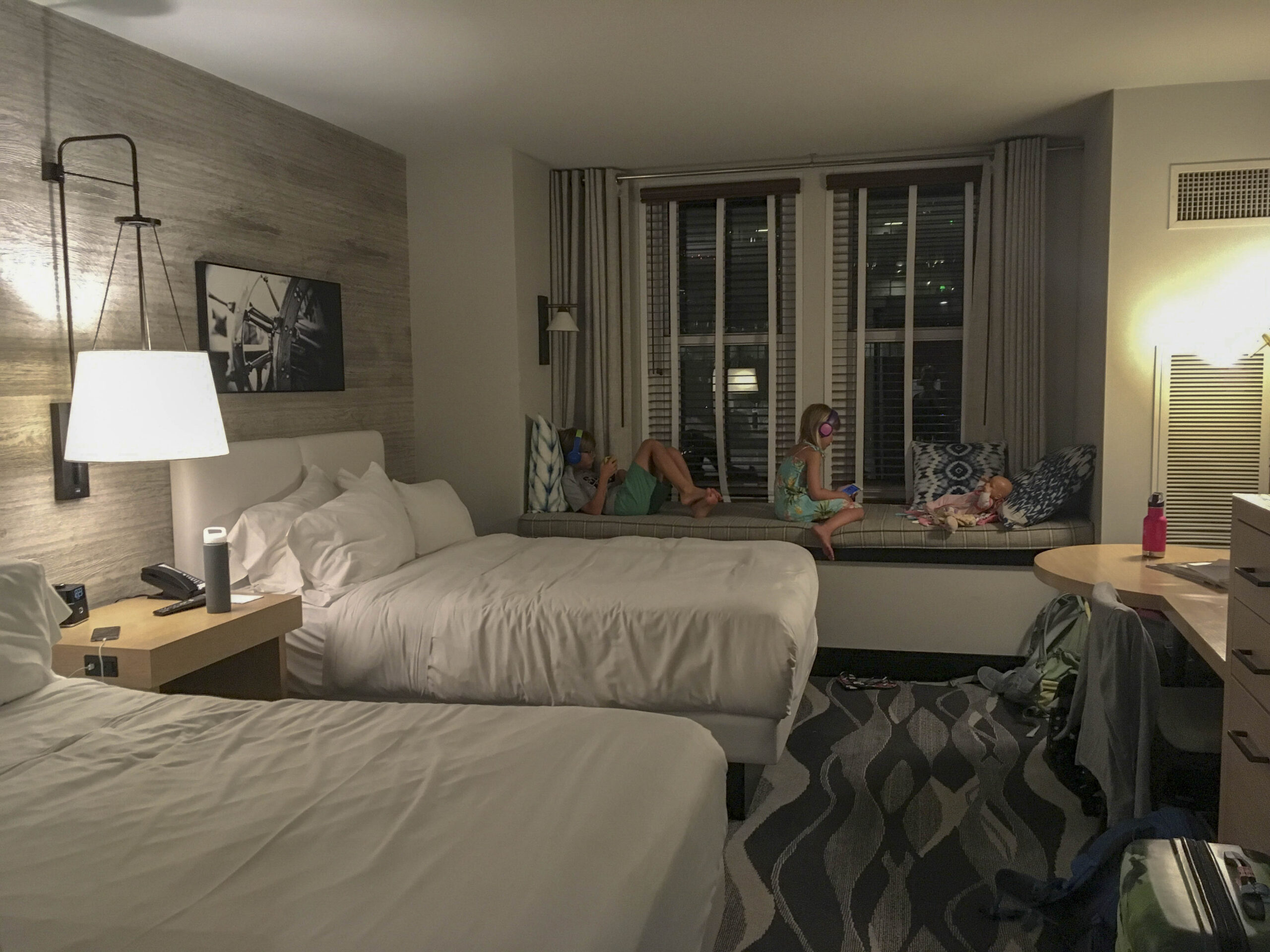 Die Zimmer sind modern eingerichtet, nicht besonders gross, haben aber eine Fenstersitzbank, wo „gechillt“ werden kann. (Ja, unsere Kinder finden „chillen“ mittlerweile cool).