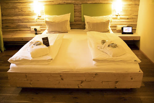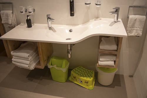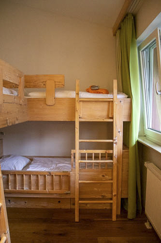 Alle Suiten verfügen über ein eigenes, kleines Schlafzimmer mit Kajütenbetten. Einzige Ausnahme bildet die Casalino Suite, welche nur über ein Doppelbett verfügt und sich somit bestens für mitgereiste Grosseltern eignet. Wir haben uns für die Suite Joy entschieden. Diese fällt in die Kategorie der mittleren Suiten, war für uns aber mehr als gross genug. Praktisch ist das Bad mit dem Handtuchwärmer an welchem nasse Skikleider schnell trocknen und der grosse, begehbare Kleiderschrank, wo sich unsere Packwürfel und die Koffer schnell und übersichtlich verräumen liessen. Grundsätzlich haben wir aber nur im Zimmer geschlafen und geduscht, weshalb wir auch mit weniger Platz gut zurecht gekommen wären.