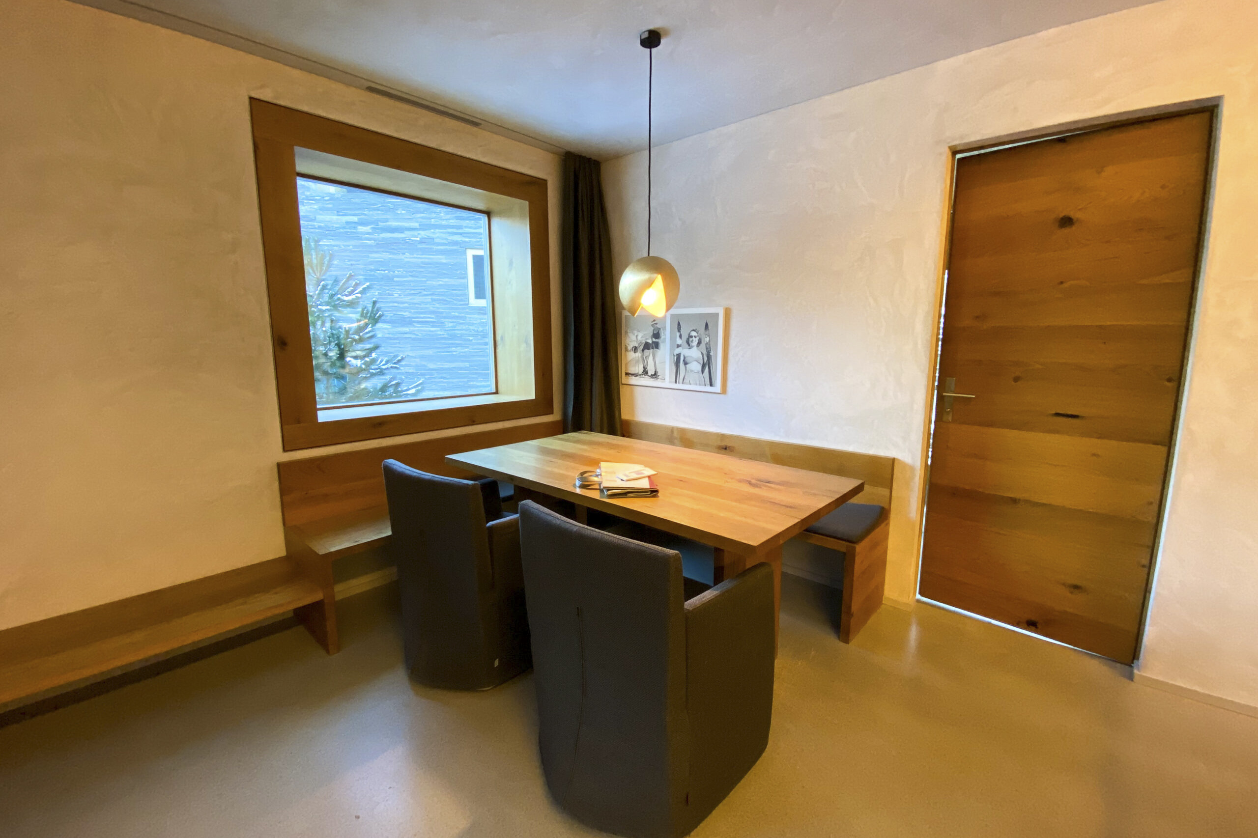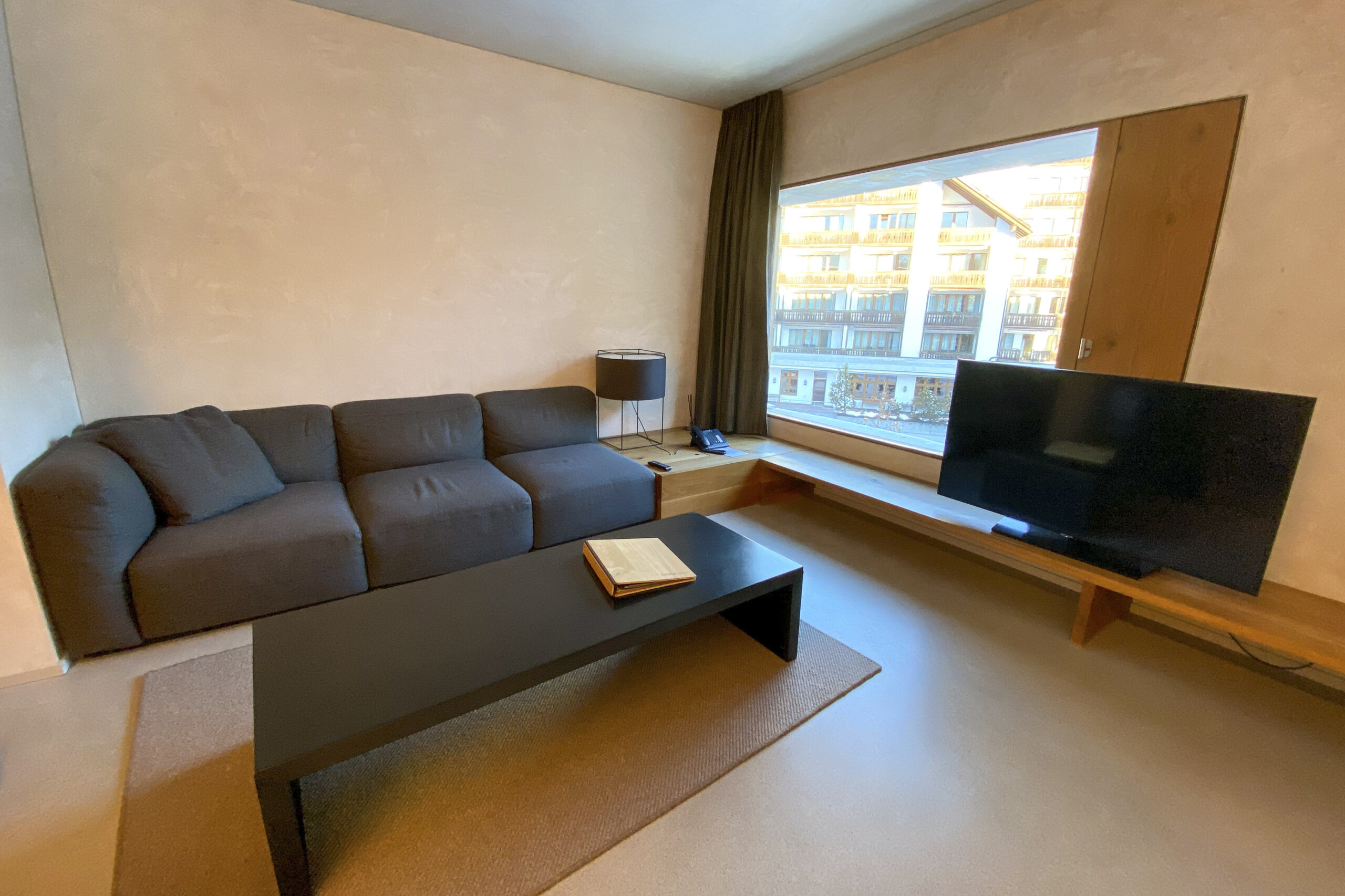 Wir haben uns für ein 2-Zimmer Superior Appartement entschieden. Auf rund 61 m2 findet sich eine gut ausgestattete Küche, eine bequeme Sitz- und Essecke, ein Sofa mit gutem Blick auf den grossen Fernseher, ein Schlafzimmer mit Doppelbett und ein Schlafzimmer mit zwei Einzelbetten. Das halboffene Bad mit Regendusche und Dampfbad befindet sich zwischen der Küche und dem Kinderschlafzimmer. Das separate WC und die Garderobe befinden sich im Eingangsbereich. Das Skidepot befindet sich in Haus B, direkt beim Zugang zur grossen Gondel. Im geräumigen Schrank lassen sich Skis, Snowboards, Schuhe und Helme von 4 Personen sicher verstauen.
