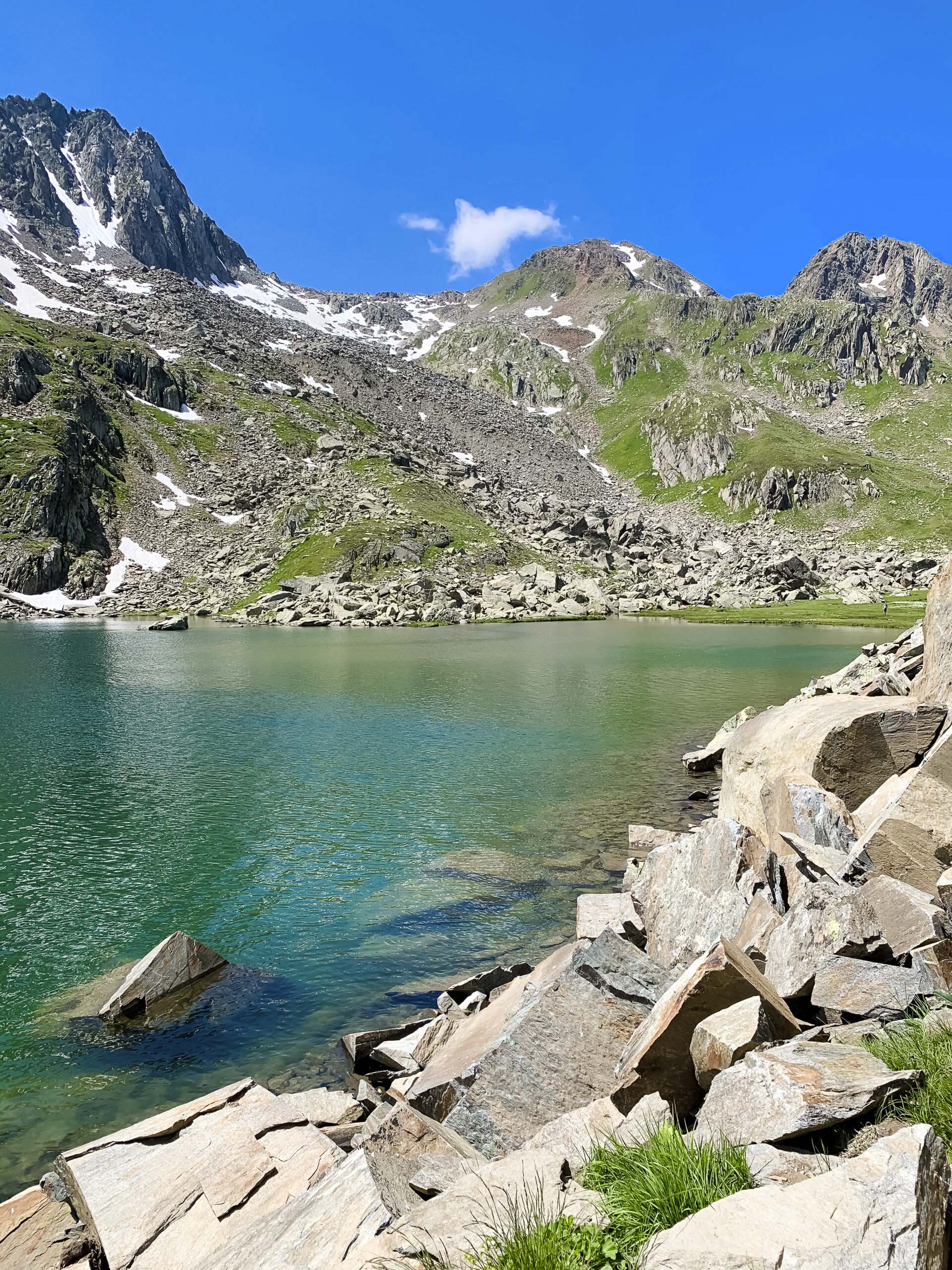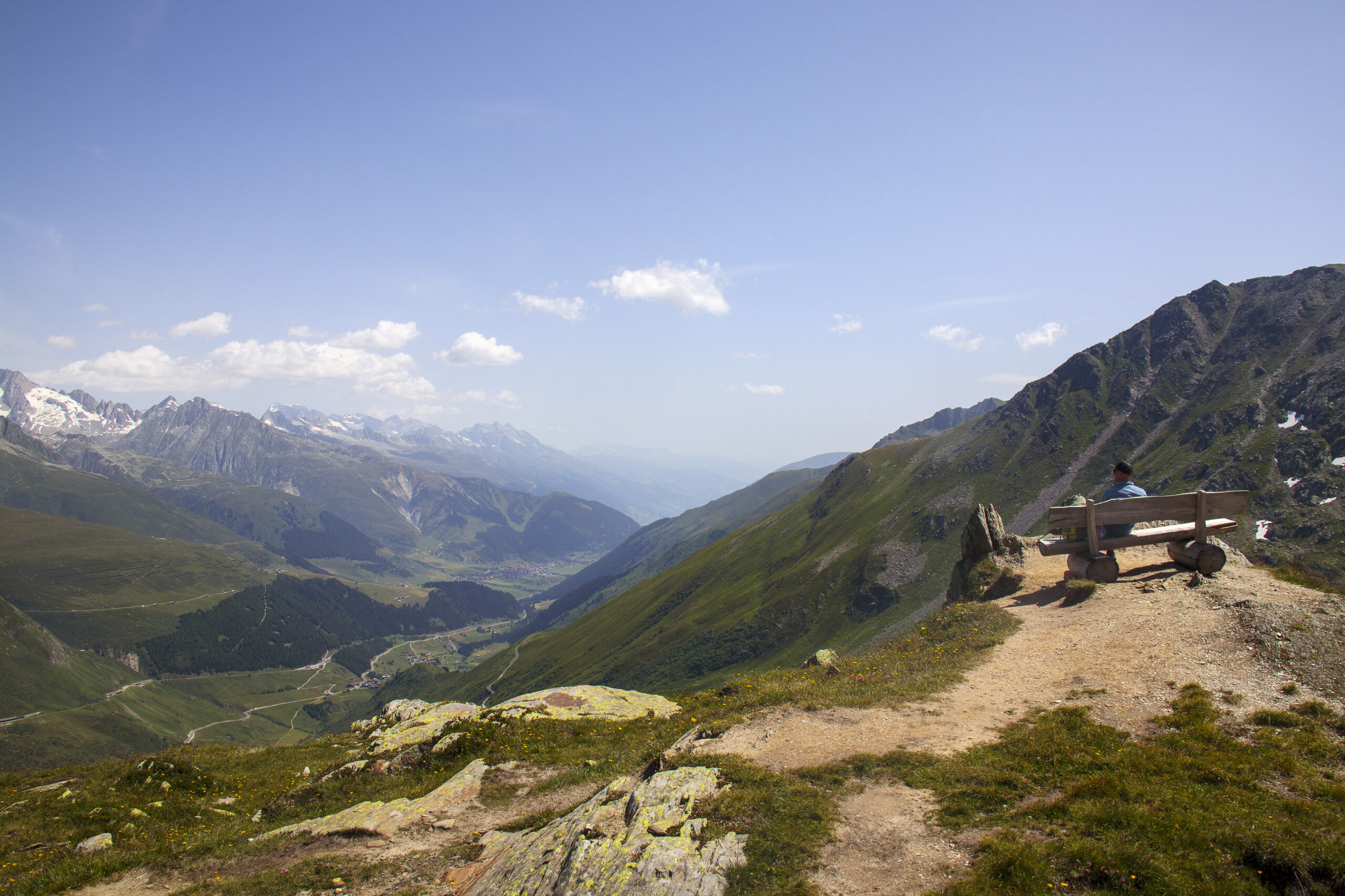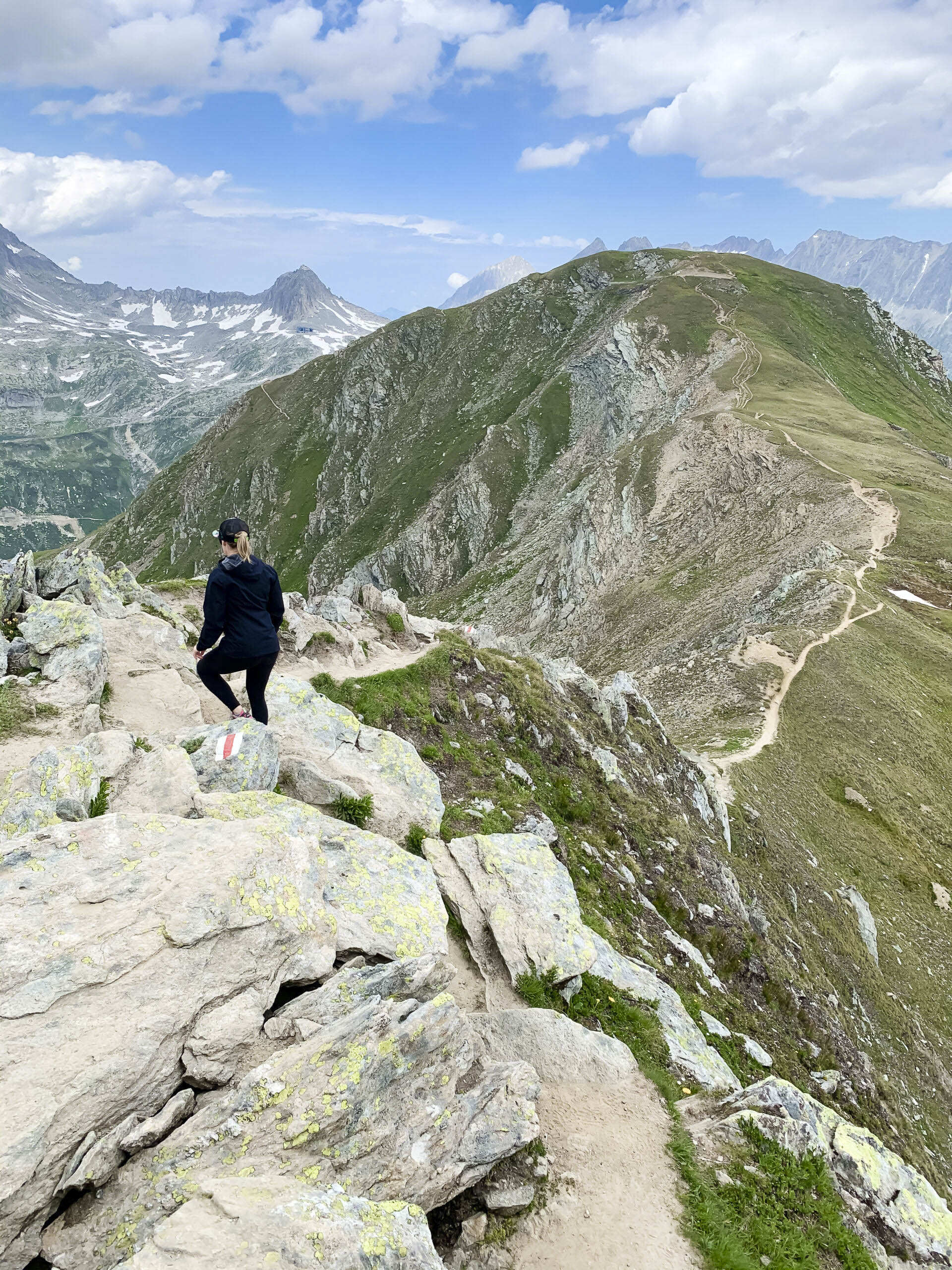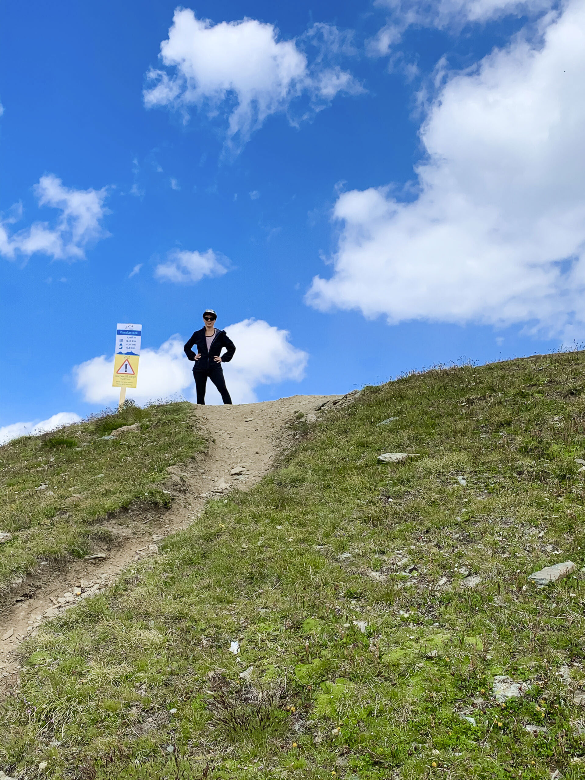 Mittlerweile hatten sich am Himmel erste Wolken gebildet. Während wir an der Badushütte vorbei liefen, ahnte ich bereits, dass uns der Weg noch sehr viel weiter nach oben führen würde. Der Weg wurde immer steiler und die Wolken dunkler. Während wir schnell aufwärts laufend unsere Regenjacken anzogen, fielen bereits die ersten Regentropfen vom Himmel. Irgendwann erreichten wir den Pazolastock auf 2740 m. ü. M. um dort von einem Schild mit der Aufschrift „schwieriger Abschnitt“ begrüsst zu werden. Das Wetter hielt zum Glück und es blieb uns nichts anderes übrig, als den Abstieg rasch möglichst hinter uns zu bringen. Nach weiteren 90 Minuten in welchen wir mit zügigen Schritten Berg abwärts liefen, erreichten wir den Parkplatz. Die letzten 200 Meter zum Auto rannten wir im Hagelschauer…. Neben dieser Wanderung gibt es in der Region noch unzählige andere. Pascal jedenfalls hat vorerst Wanderplanungsverbot und unsere Beziehung eine weitere Hürde gemeistert 😉